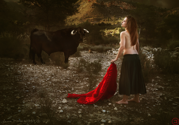 Bravery could be understood as courage or natural aggressiveness, to face new situations, complications ... The woman faces the bull, and the animal has noticed her presence, now it should come an outcome.