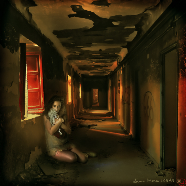 The parallel lines drawing the floor and the ceiling point towards that place without any possible end, an exhausting wandering. The path of the mind. There is no exit, no windows, no doors that can help. The end is reached when the exhausting work of the mind ceases in its endeavor. They say that our second brain is our stomach. Being able to suffer and control the body equally. The woman holds tightly in her chest the only certainty she has got, her doll ... while she is up in the whirlwind of madness and with a certain fear in her face, her eyes expressing frustration and amazement.Quiet, she is waiting for the end of this exhausting wear, without a break in the mind; Wondering: "Why are you so unequal in this balance: the soul with feelings vs. mind itself?"... She keeps waiting...