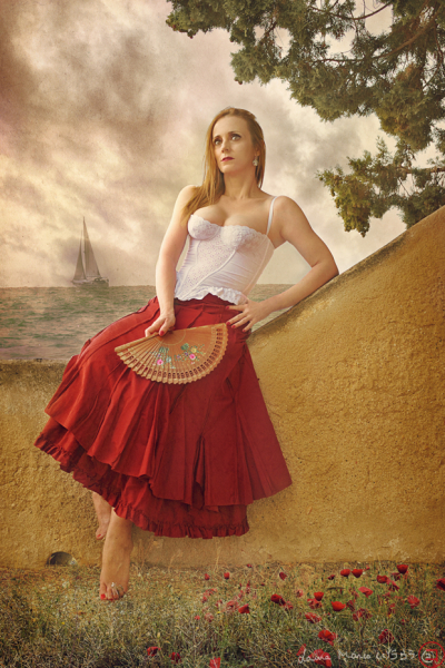 In the background the sea, with its amplitude and a sailboat that moves away, following an unknown path. Perhaps the sea breeze is enough to refresh her senses and does not need the continuous swing of the fan. In the scene, it combines a challenging sky, water with its extensive kingdom great knower of so many places in the world and precious land where she treads her way. A land that knows her and that loves her.