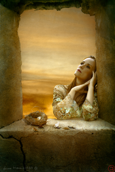 Determined and defiant, with pure deliberate eyes, she sits in the pathway of the rocks, as the actual owner of them and without any chain, any sacrifice, nor anyone who can control the destiny of her life. That rock that should serve to hold her, bounded and waiting for horrors of demons ... It serves as a sure entwinding place to sweeten her dreams. In the footsteps of the light breeze, which moves her dress and the skirt is also moved to caprice by the air. All reminds us of wings of freedom: a place where world and sky are one.