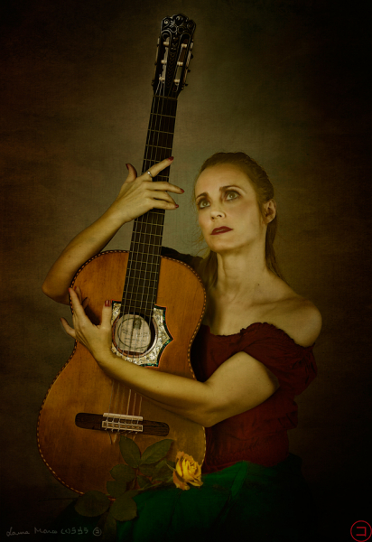 Guitar can be held in an execution pose, which is what most people decide to use, where they try to place the most complicated chord possible or ... it can simply be embraced as an object of appreciation and affection, as a companion. That has been my choice, presenting the two protagonists side by side. This guitar does not exist in reality, it was born with the magic of photography, it is "photo-made", beyond diaphragms, apertures, photometers and other paraphernalia, it was born from "the amazing craft of photography", creating it piece by piece, to make it as beautiful as it is. I'm not saying that it has more merit than if it had been photographed directly from reality, but it does have a lot more work, because the instrument starts from scratch and is a big challenge.