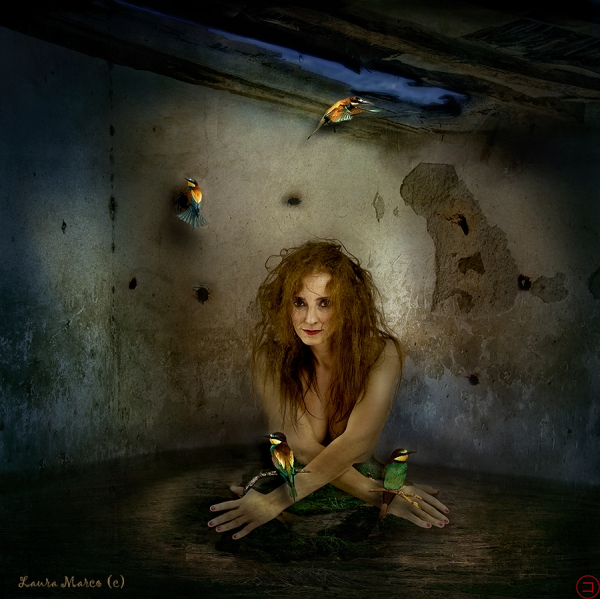 Outside, it's already night and it's slightly cold. The bee-eaters return to their holes in the earth. Safe and warm burrows, tunnelled into the side of the sandy wall. They don't like the cold, so they will soon migrate to warmer lands, they'll go to more meridian places, in consonance with its colourful plumage, made to shine under the sun. Mother Earth is coming out to greet them. She's quiet and serene, spending her time with them. It's difficult to see her in the surface... in a human shape. So, it's a unique moment of closeness. Birds and Mother Earth rest easy, confident, being the same thing, the same natural link. And we all will get back there, returning to those soft and warm colours, to this refuge and calmness that is the Earth. I do not feel like going outside, I prefer to watch them together in this safe place, and you?...